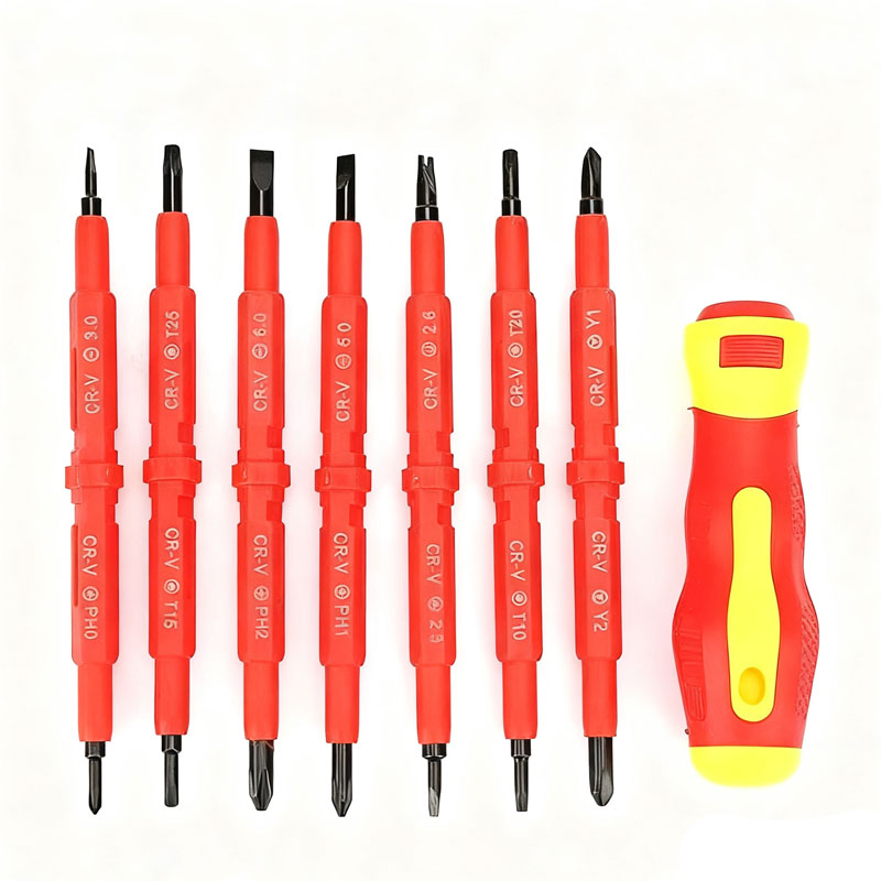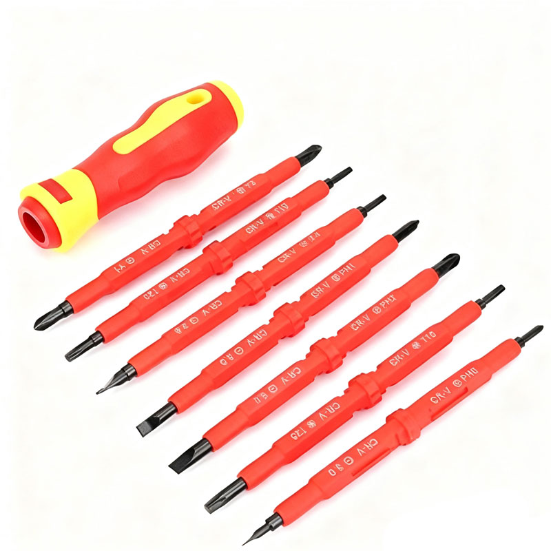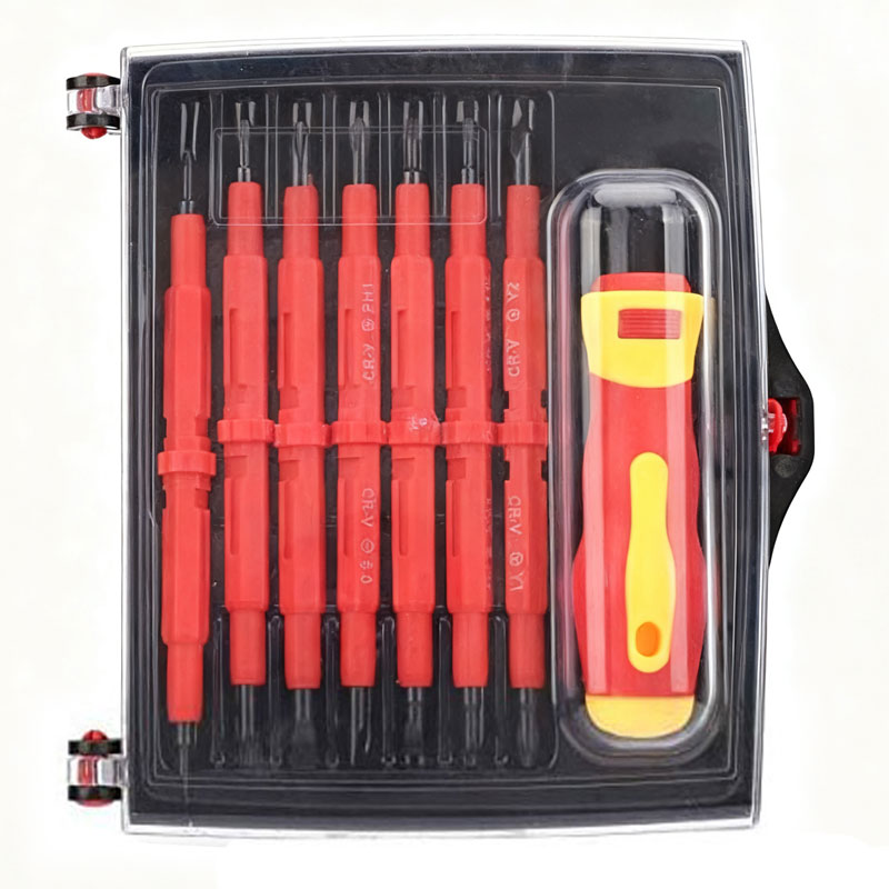Este juego de destornilladores aislados de 7 piezas está especialmente diseñado para electricistas y trabajos que requieren altos estándares de seguridad. Fabricado con acero cromo-vanadio de alta calidad, ofrece puntas de gran dureza y excelente torsión. Cada herramienta está recubierta con una capa aislante de alto nivel, capaz de resistir hasta 1000V. Incluye una caja de almacenamiento resistente, ideal para organizar y transportar, siendo una opción segura y práctica tanto para profesionales como para uso doméstico.