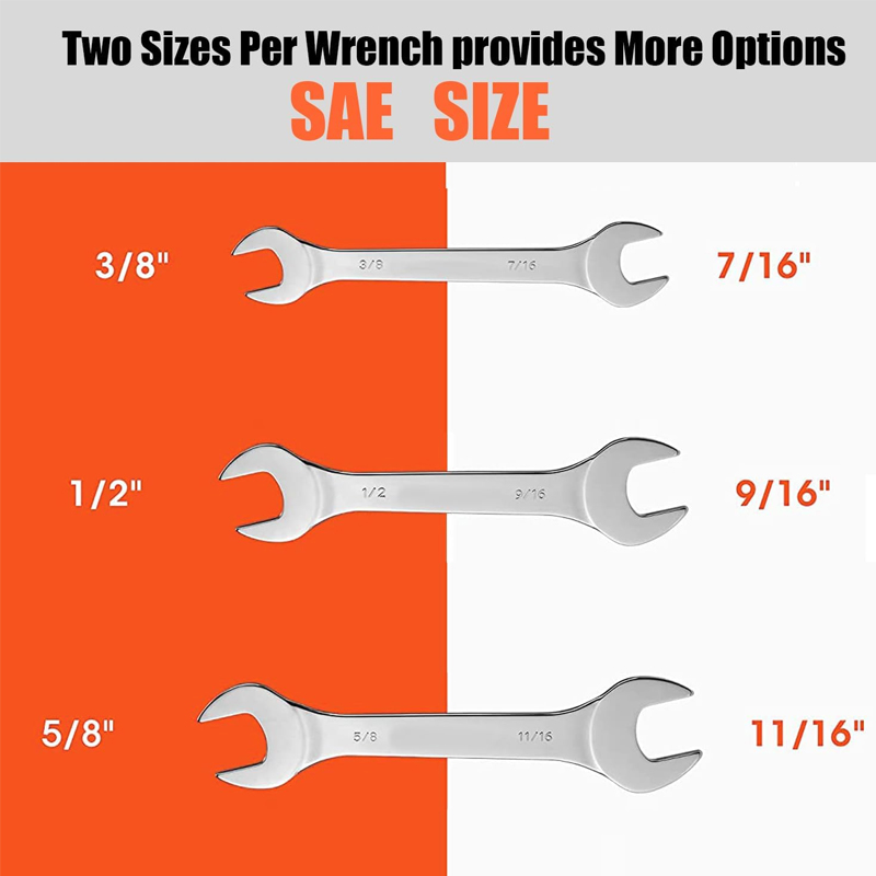 Juego de 3 llaves de boca fija con 6 tamaños SAE para llaves de doble boca: 3/8″ x 7/16″, 1/2″ x 9/16″ y 5/8″ x 11/16″. Las especificaciones grabadas en la llave son claras y fáciles de identificar.