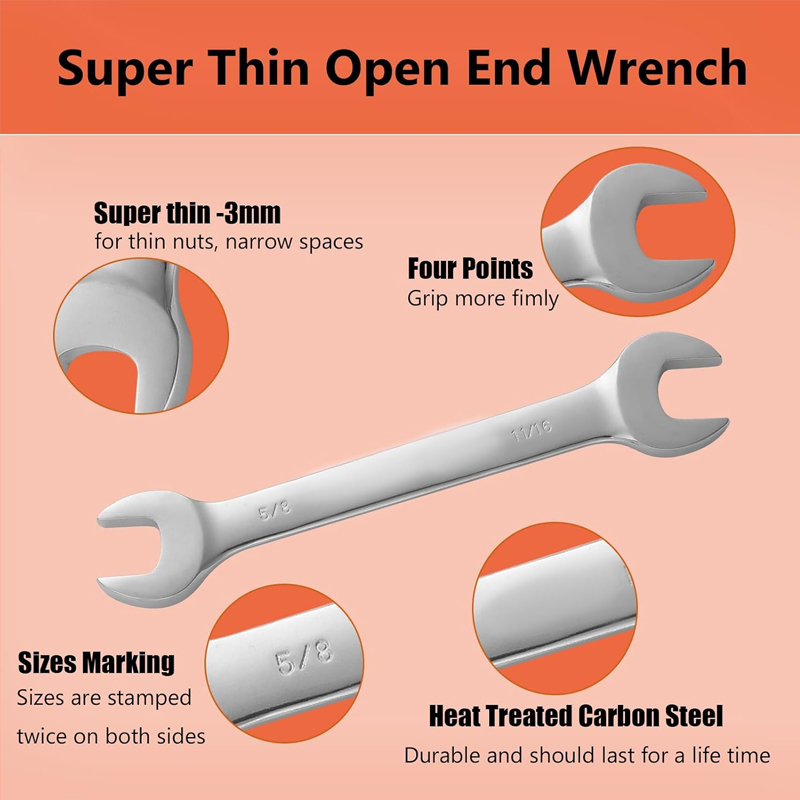Amplia gama de usos: Este juego de llaves de boca fija ultrafinas es especialmente adecuado para situaciones que requieren precisión, como la reparación de bicicletas, motocicletas, mecánica, electrónica, automotriz, electrodomésticos, etc. Por lo tanto, la llave de doble boca delgada es una herramienta esencial para muchos técnicos profesionales y aficionados al bricolaje.