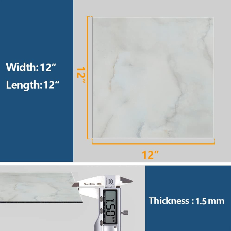 〚Azulejo autoadhesivo〛: El suave azulejo autoadhesivo de mármol blanco está hecho de vinilo de alta calidad, impermeable, resistente al aceite y a los arañazos. Mide 30 x 30 cm y tiene un grosor mejorado de 1,5 mm. Es duradero y resistente para zonas de mucho tráfico. Cubre aproximadamente 3,7 m² (4 piezas por caja).