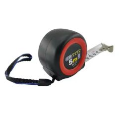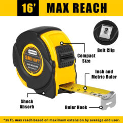 • Cinta métrica de 5 m (16 pies) con regla en pulgadas y métrica, tamaño compacto, amortiguación, retráctil